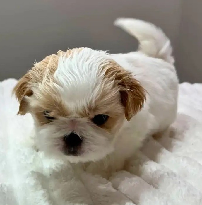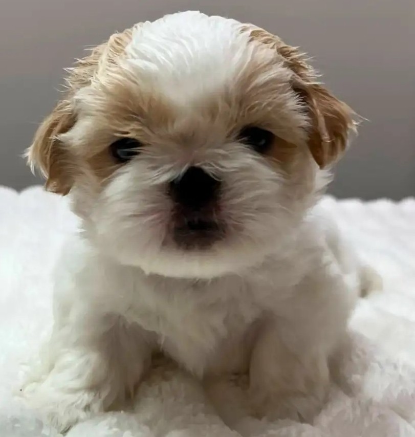 Bella ist eine winzige, schneeweiße Imperial Shih Tzu Hündin mit zarten cremefarbenen Abzeichnungen an den Ohren und um die Augen, was ihr einen sanften, lieblichen Ausdruck verleiht. Ihr plüschiges Teddyfell ist dicht, weich und wunderschön geformt, und ihre runden dunklen Augen sowie das kurze Schnäuzchen lassen sie wie ein kleines Stofftier wirken.
